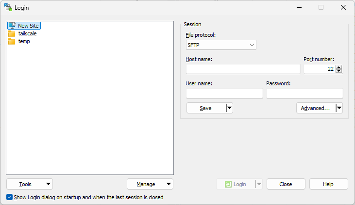 - WinSCP 실행 → Host Name(IP), 사용자명 입력 → 프로토콜 SFTP 선택