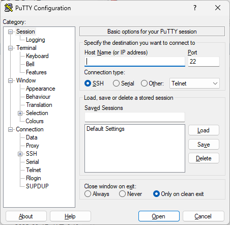 - PuTTY 실행 → Host Name(서버 IP) 입력 → Port 입력(기본값: 22) → SSH 선택