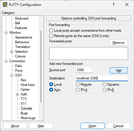 - 왼쪽 메뉴 [Connection → SSH → Tunnels] 이동